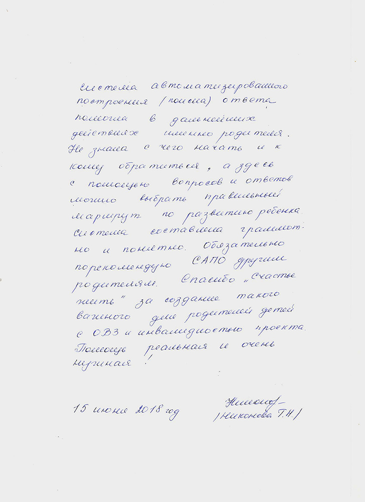 Необходимо отметить, что данный ресурс разработан в дополнение к очным консультациям и сопровождению, к семинарам и практикумам. Он не заменяет консультации специалиста и не является инструментом для постановки диагноза. Он позволяет увидеть, какие существуют технологии помощи ребенку с учетом имеющейся у родителей (специалистов или педагогов) исходной информации, дает возможность определить направление для дальнейшей работы или действий.