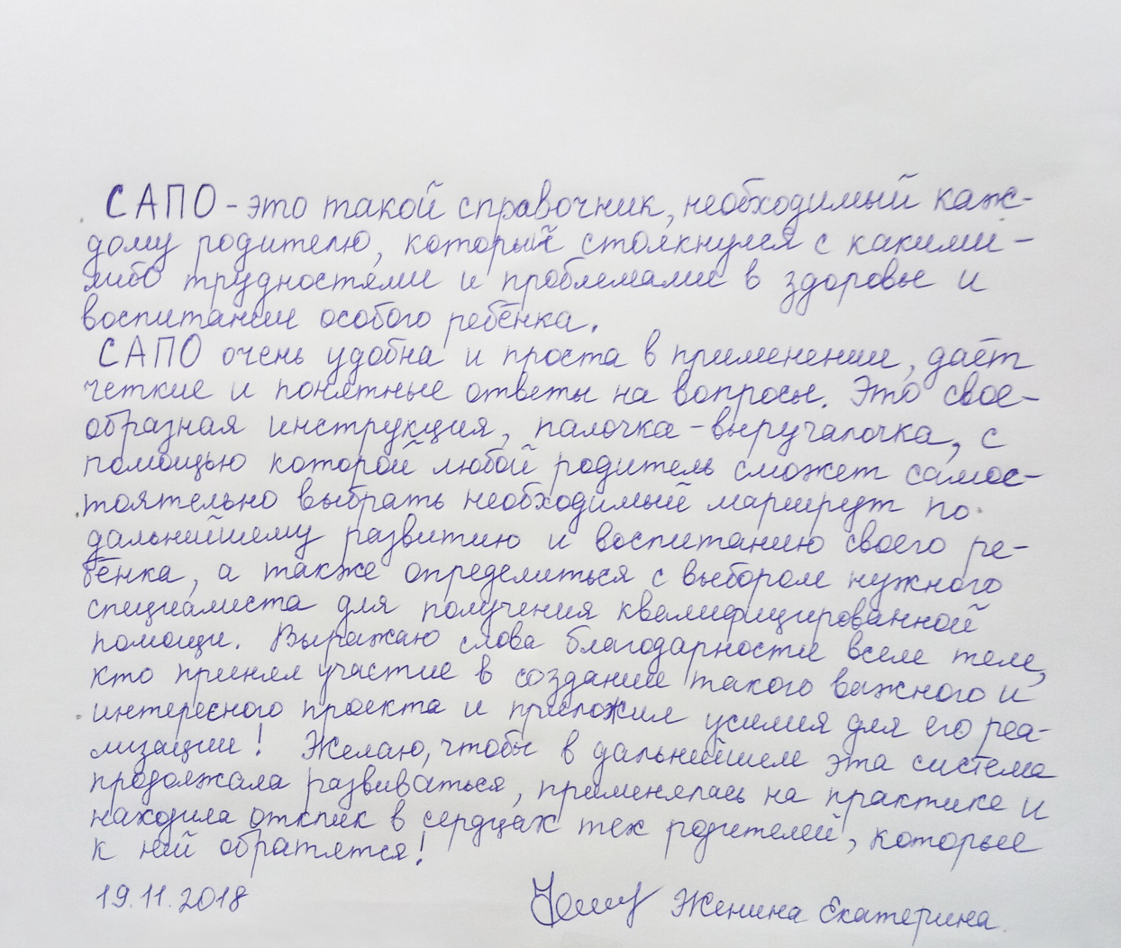 Иными словами, воспользовавшись САПО, родитель увидит, что нужно учесть при взаимодействии с ребенком, к какому специалисту стоит обратиться, или на какие методики коррекции и реабилитации стоит обратить внимание. В САПО заложена информация о различных методиках физической и физиотерапевтической реабилитации, психологической коррекции, в том числе, с использованием специального оборудования, о методиках альтернативной коммуникации, коррекции поведения и познавательного развития, арттехнологиях, методах анималотерапии). В ряде случаев, также предусмотрена возможность очной записи на консультацию.